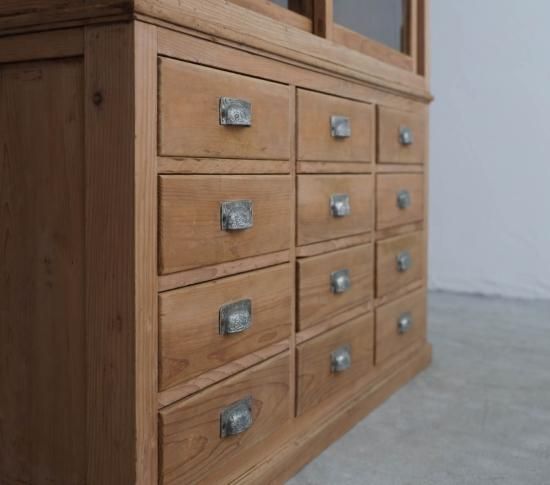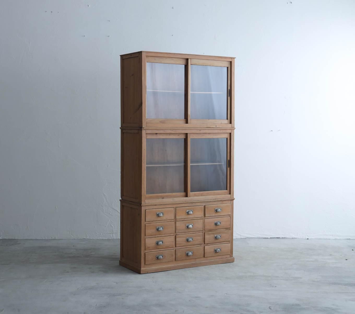 上段2段がガラス戸棚、下段が引き出し棚の構成。