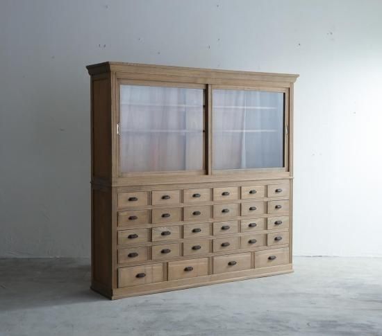 まず目を引くのは、規則的に並んだ計28杯の引き出し。薬屋さんが薬を分類して入れていたのか、手芸屋さんが糸を収納していたのか。 真実はわかりませんが、そんな想像に花が咲く趣深い収納棚です。現代に蘇った姿を眺めていると、堂々とした威厳すら感じさせます。