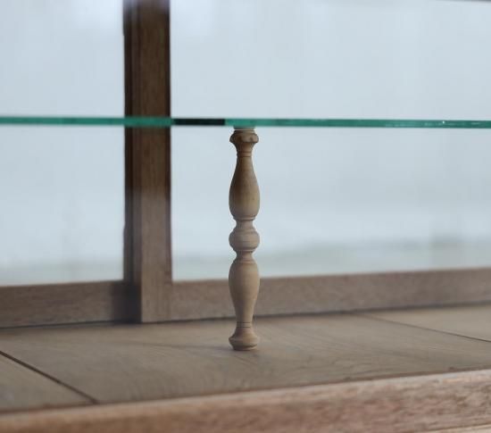 中央の棚板を支える支柱には、他の古家具から取り外し保管していたろくろ脚のパーツを加工して使用。控えめながらも手仕事の余韻を感じさせるアクセントとなっています。