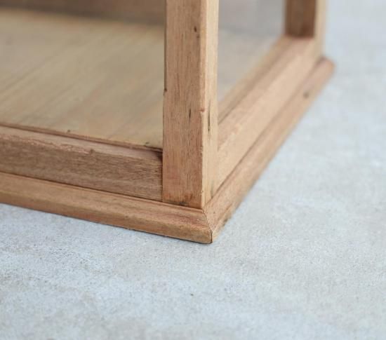 角の丸みや繊細な面取りなど、和家具らしい柔らかな意匠が随所に見られ、素朴でありながらどこか凛とした佇まいを感じさせます。外枠には、長年の使用を経て味わいを増したラワン材が使われており、時間の経過とともに育まれた木肌の風合いが空間に温もりを添えます。