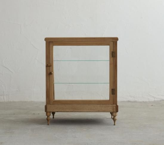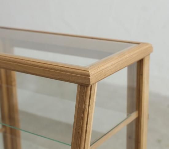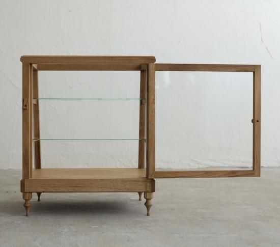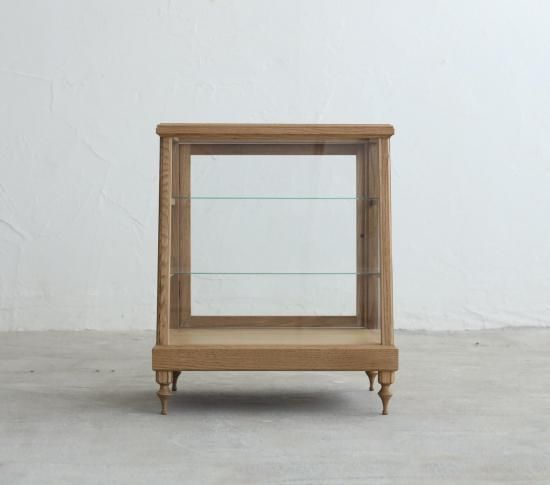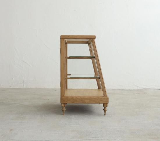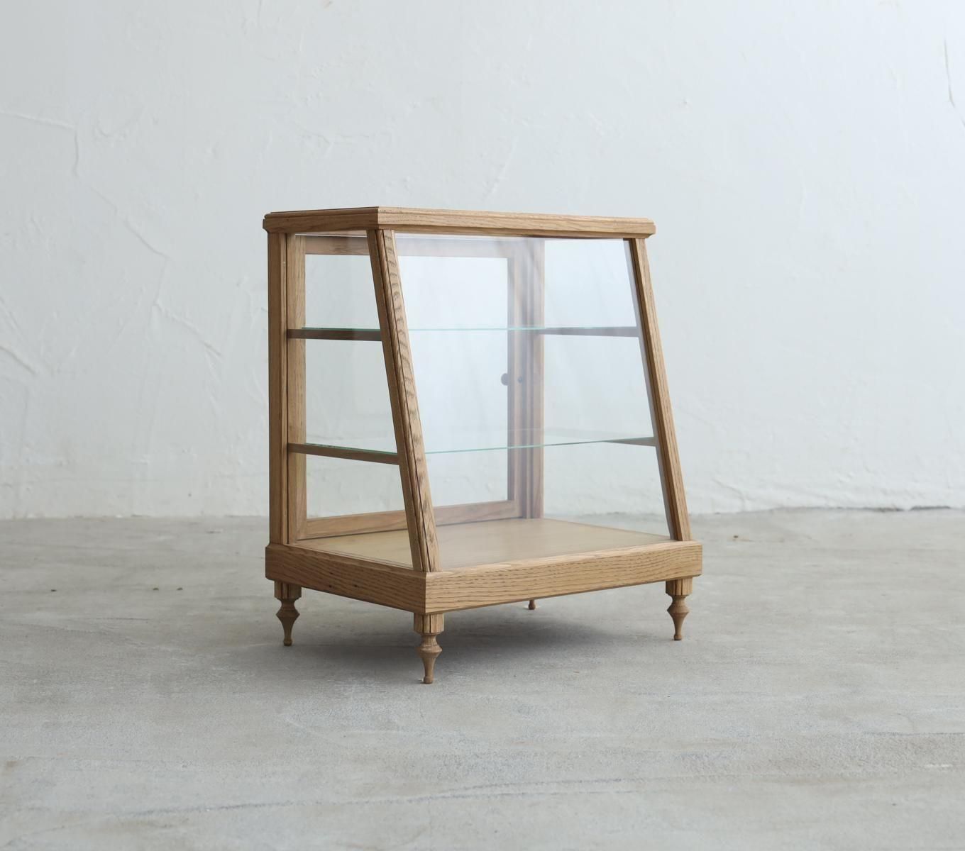 ろくろ脚を取り付けたICCAオリジナルプロダクトの斜め切りの卓上ショーケース「CHARM」です。