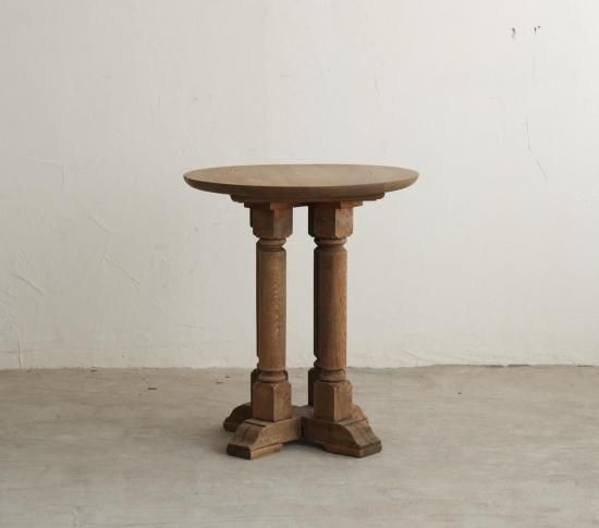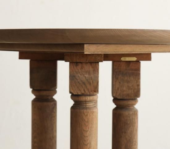 良質なナラ材でつくられた丸テーブル。四本のろくろ支柱が天板を支える、大正ロマン香る一台です。