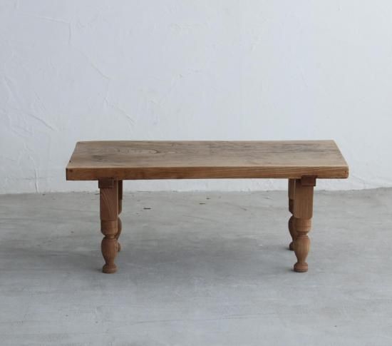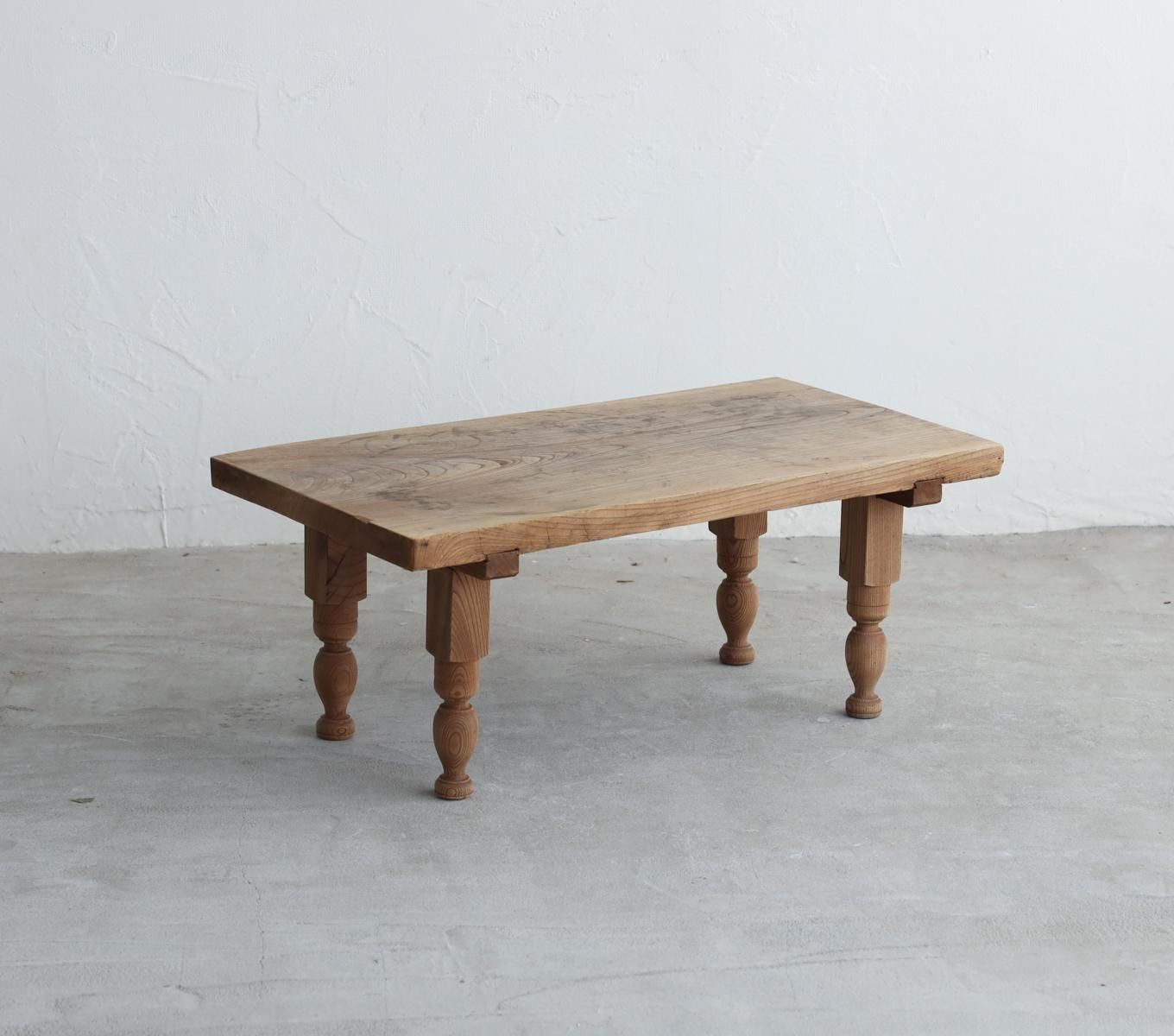 欅材の一枚板を天板にあしらった、ろくろ脚のアンティーク・コーヒーテーブルです。
