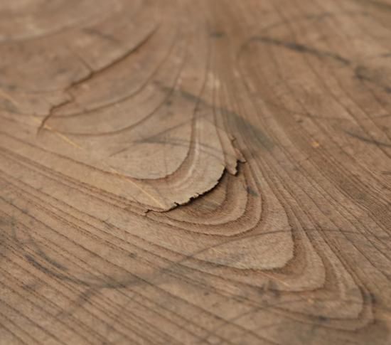 大ぶりで力強い木目をもつ国産欅(ケヤキ)ならではの存在感が際立ち、経年によって刻まれた風合いが一枚板ならではの奥行きを添えています。
